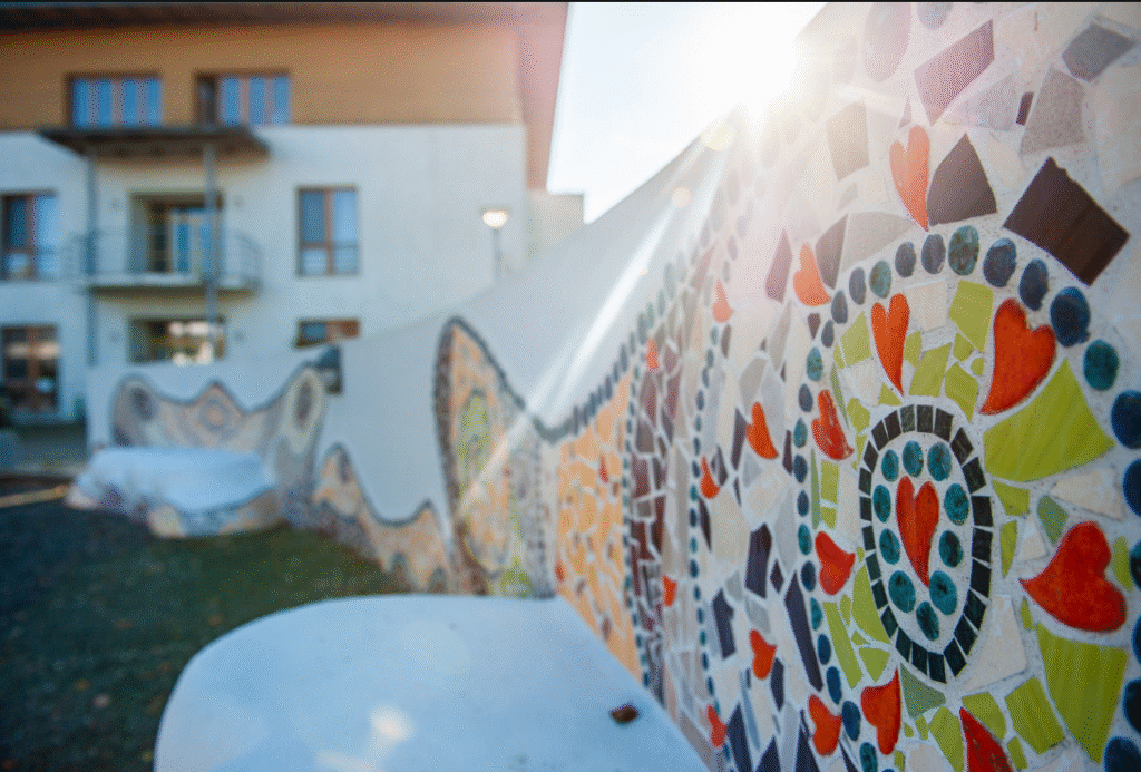 Pro obyvatele i návštěvníky vznikly v předprostoru krásné posezení s uměleckými lavicemi